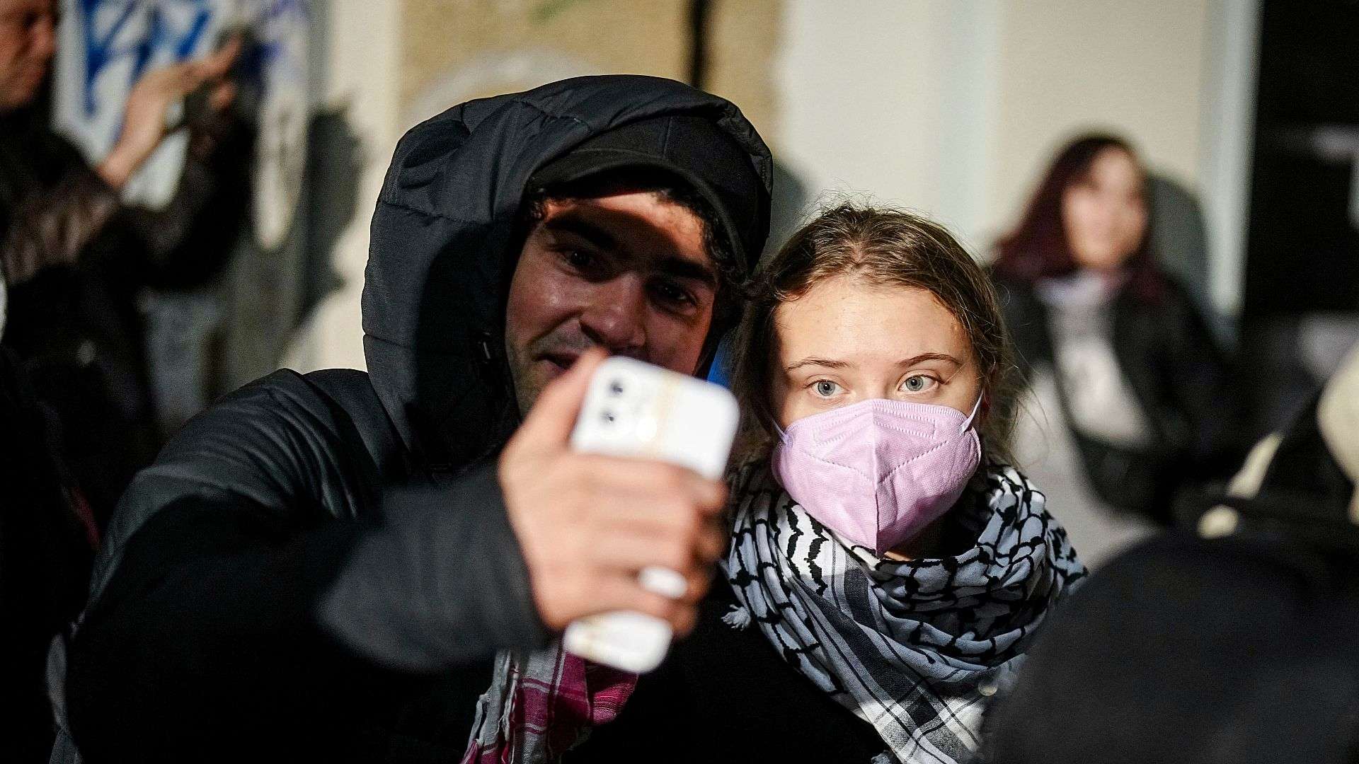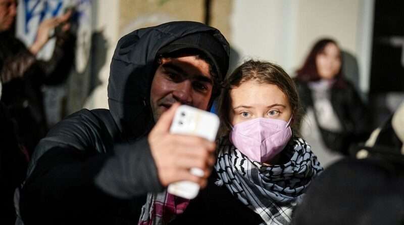 Thunberg en son pazartesi günü Berlin’de 7 Ekim saldırılarının yıl dönümü için düzenlenen bir protestoya katılırken görülmüştü. Protestolarda, dört gösterici havai fişek patlattıktan ve araba lastiklerini ateşe verdikten sonra gözaltına alındı.